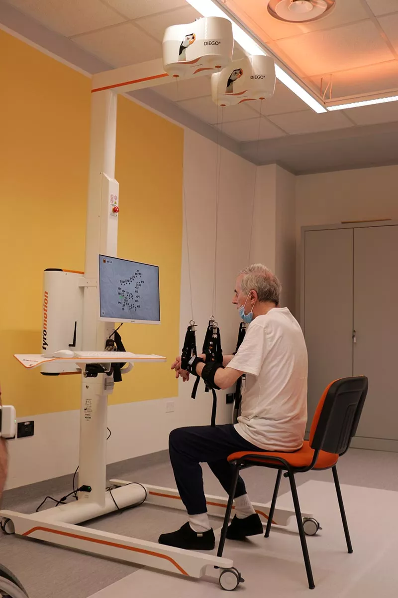 DIEGO: sistema robotizzato multidimensionale per la riabilitazione monolaterale o bilaterale dell’arto superiore; consente di lavorare con allevio del peso delle braccia, lasciando al terapista la scelta tra l’esecuzione di task riabilitativi sfruttando oggetti reali o l’interazione con giochi di realtà virtuale.