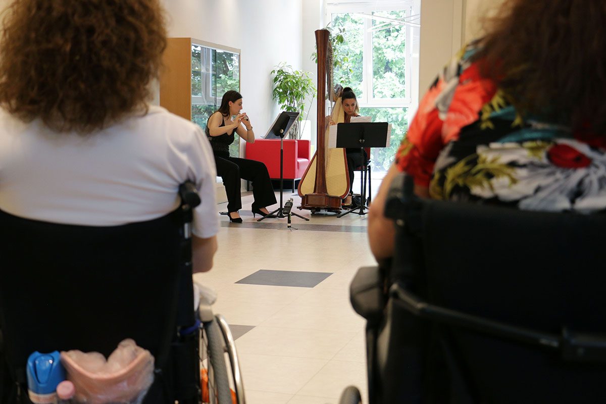 Questo pomeriggio, 5 giugno, l’Orchestra Giovanile Cherubini, fondata dal maestro Riccardo Muti, ha suonato per i nostri degenti e familiari. Chiara Picchi al flauto, Francesco Paolo Morello alla viola e Antonella De Franco all’arpa si sono esibiti con opere di Luigi Boccherini in “Sonata in si bemolle maggiore op. 5 n. 1”, Claude Debussy in “Sonata n. 2 in fa maggiore per flauto, viola e arpa” e Nino Rota in “Sonata per flauto e arpa”.